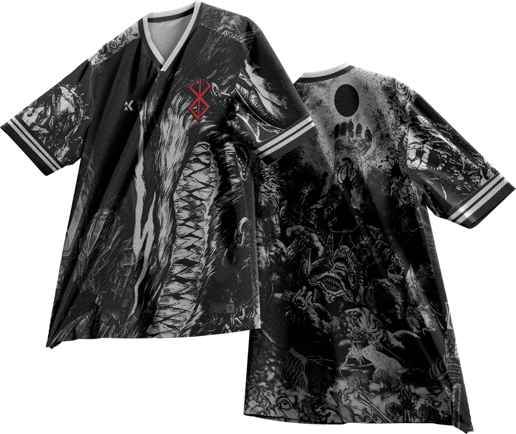 Apresentamos a Guts Jersey, uma camisa de futebol exclusiva inspirada no imponente protagonista de Berserk. Com um design sombrio e funcionalidades de alta performance, esta peça é perfeita para os fãs que desejam incorporar a força e a resistência de Guts em suas atividades esportivas.